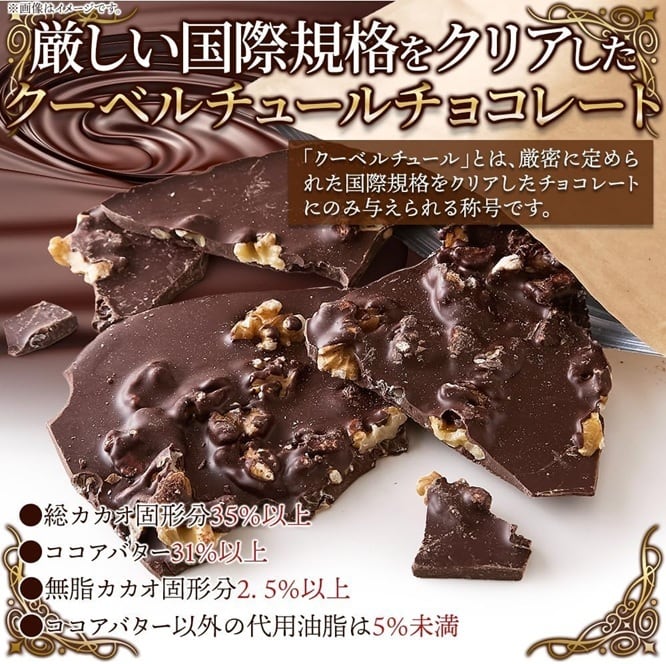✅【厳しい国際規格をクリアしたクーベルチュールチョコレート】「クーベルチュール」とは、厳密に定められた国際規格をクリアしたチョコレートにのみ与えられる称号です。●総カカオ固形分35%以上●ココアバター31%以上●無脂カカオ固形分2.5%以上●ココアバター以外の代用油脂は5%未満